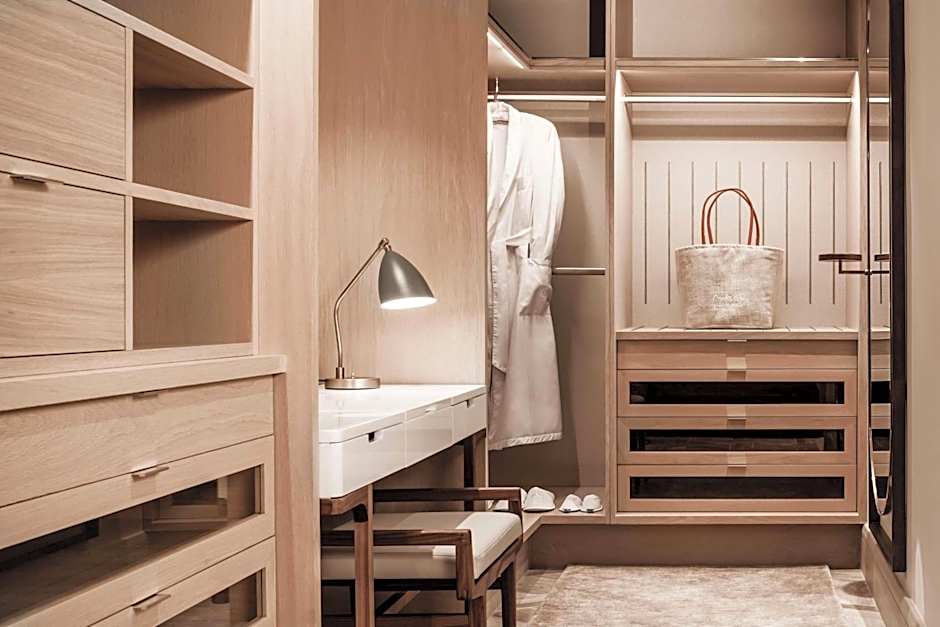 Let the sleek marble bathroom seduce you with its standalone tub and cascading shower. The connecting dressing room, mirrored and bright, is your personal space for pampering.